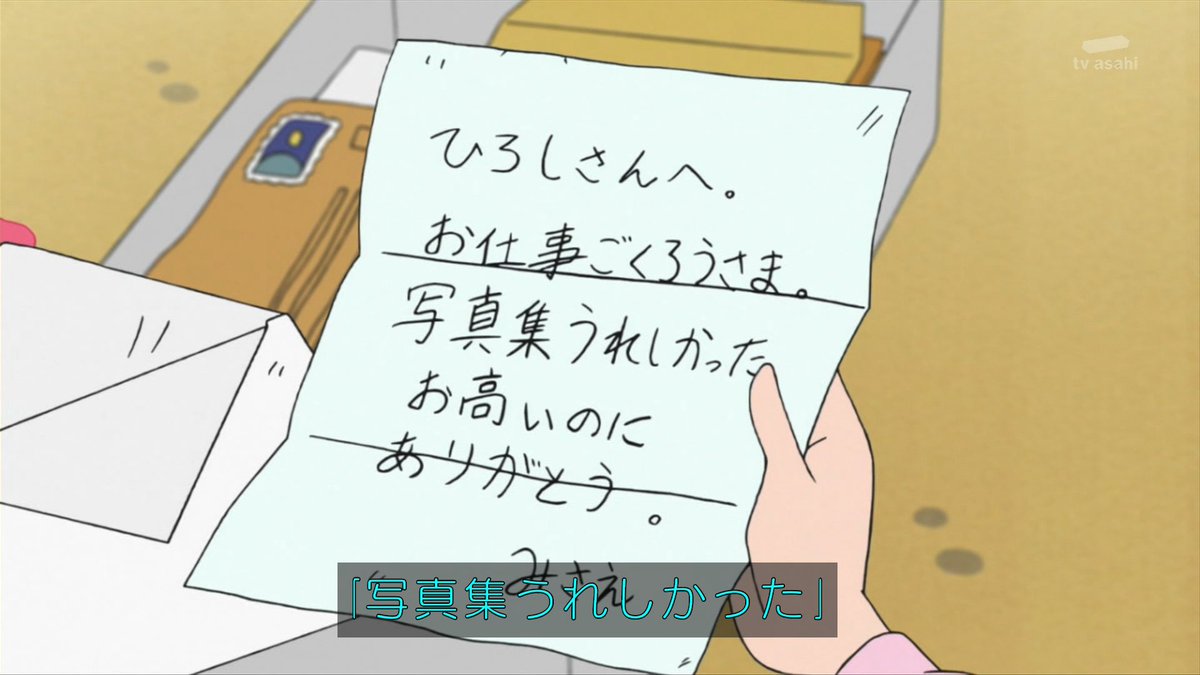 みさえが戻ってきて、マフラーが売れたことを知る。 いったい、買った人は誰なのか。 次の日の朝。 ひろしはいつもどおり、仕事に出かける。 かばんから、ちょっとはみでているもの。 それは、まさしくみさえの作ったマフラーなのを しんちゃんは気がApr 01, 17 · みさえの数日がかりで編んだ下手くそなマフラーだけがバザーで売れ残ってて、みさえが席を外した間にひろしが来てマフラーを買う。みさえはひろしが買ったのを知らないし、ひろしも言わない。家を出てから外でマフラーを巻いて会社に行くひろし。Apr 26, · みさえが数日かけて編んだ下手くそなマフラーだけ売れ残ってて、みさえが席を外した間にひろしがマフラーを買う。みさえはそれを知らないしひろしも何も言わず、家を出てから外でマフラーを巻いて会社に行くひろし。かっこよすぎ。